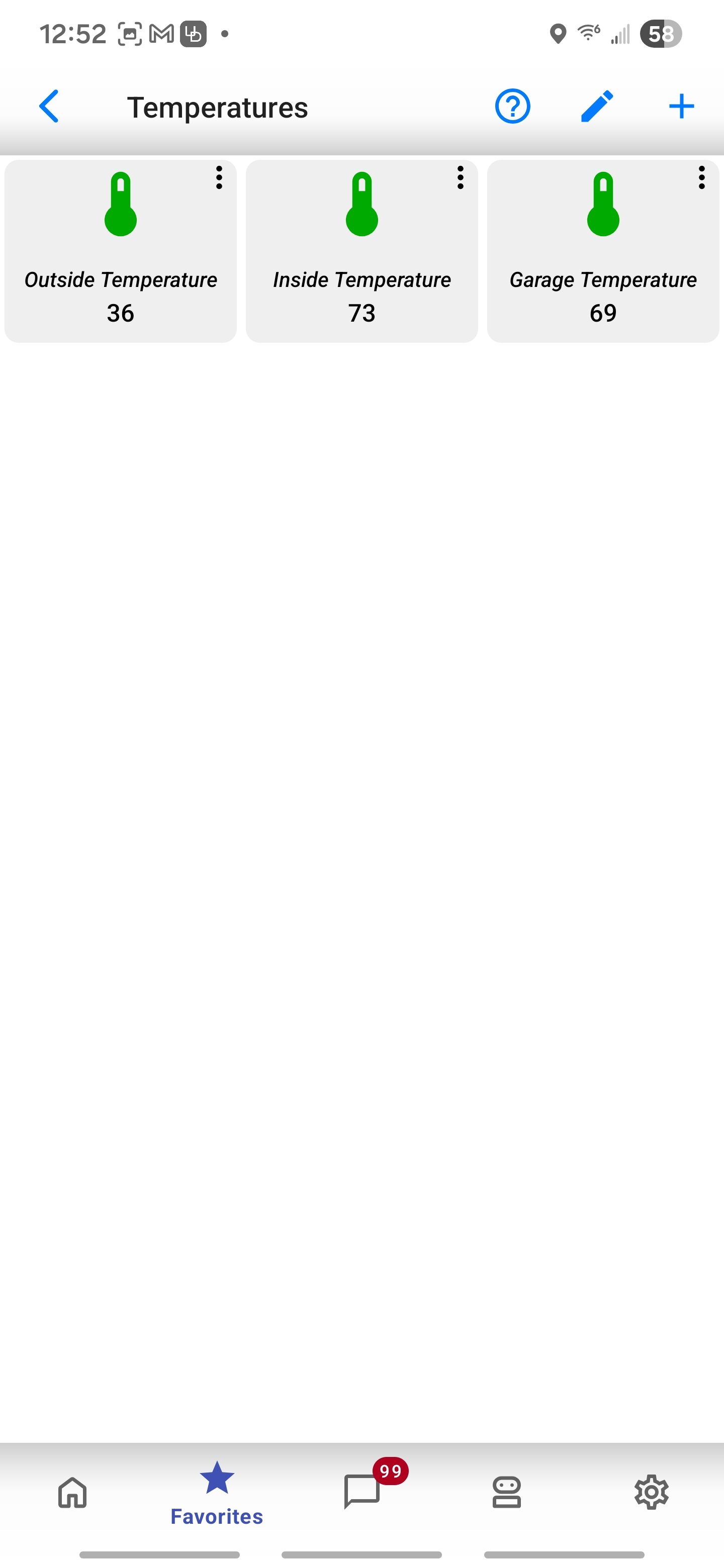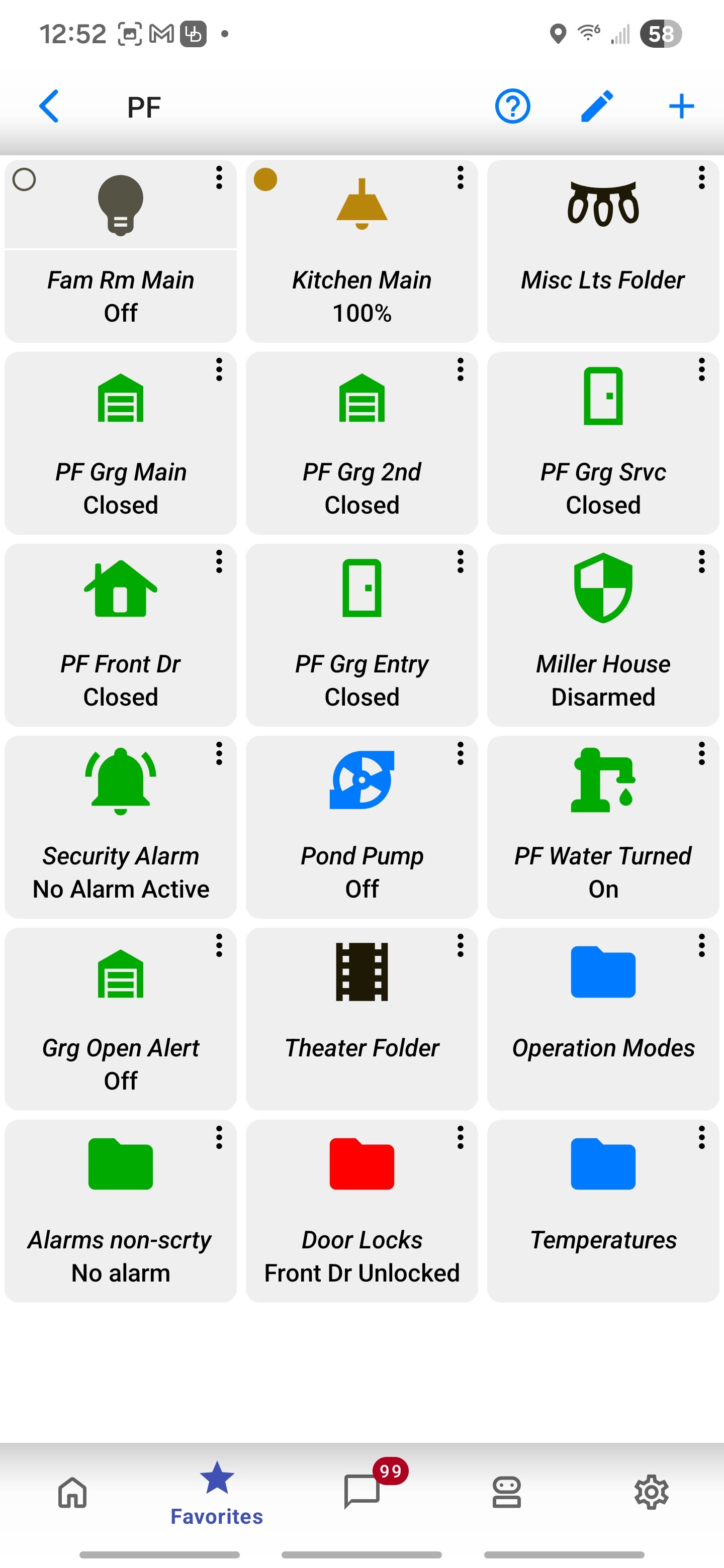 First, I use UD Mobile and EISY extensively now days to manage most of my IOT devices and for the most part it is great. I have two questions/requests. 1) I use folders in the Favorite area to provide a top level view of things with the ability to drill down into subfolders when more detail is needed. For example I have two EISY systems (one in our main home and one in our cabin) so I have two folders at the top level in Favorites, one for each house. When the Folder is pressed for either system it opens a top level page that contains important details for each system along with more folders that can opened to drill down into the details. The goal is to keep the opening page for each system limited to one page so it can be viewed without scrolling. The opening page contains things like Alarm system status, buttons for kay lights, the state of various doors/windows, and folders to drill down into things like door locks, temperatures, more light controls, water sensors, etc. So far this all works well with one exception. When the back button is pressed in any sub-folder it always goes back to the Devices and Scenes area of UD Mobile instead of returning to the parent folder. Is this be design or am I doing something wrong? If it is by design is there a workaround could be implemented? It would be way more convenient and intuitive if the back button returned to the parent folder. 2) Expanding on the 1st topic I also use the Advanced Status Configuration settings to control the color/icons/Info displayed on many of the buttons and folders. For the most part this meets all of the needs for conveying information concisely for the buttons and folders. The one exception I have run into is that the Advanced Status Configuration is only able to use the Node defined in the Favorite, that it is associated with, for its comparison function. I have some situations where it would be real handy to be able to specify the node that the Advanced Configuration Status uses for the comparison. For example, I have temperature buttons for various temperature sensors where each of the buttons shows the actual temperature in its status field. I then use the Advanced Status Configuration for each button to changed the color of the Icon to show weather the temperature is out of range for that sensor. For some sensors this is 3 states, High, Low, and Normal. This can be calculated easily in a program and assigned to a variable but if this variable is used for the Favorite then the actual temperature can't be displayed. It would be real handy if the node used for the Favorite and for its associated Advanced settings could be selected independently. If there other ways to accomplish this I'm open to advice. Here are some screen shots of several page configurations I have set up - Top Level - The 2 houses 2nd Level - PF (Home) 3rd Level - Temperatures Folder