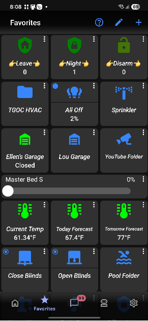 Exactly. @Javi This has been going on for at least a couple weeks. It is consistently the same nodes that don't work while other nodes that seemingly should be identical work fine. The first place I noticed it is a perfect example. I have shortcuts setup for my garage door and my wife's garage door. Both are Elk zones (zone 22 and 34). On different expansion boards, but I don't think that is a reason. When the doors are closed or open I have to change the color of the icon from red to green. So I quickly noticed that the icon was neither, but rather the default blue. Every now and then, it would populate, say "closed or open" and set the color, but typically, just blue. My wife's door, always populates. It will populate on occasion. It seems like the way to have that happen is to have the admin console open or have UD mobile open, and then change the status of the node. It will populate, but it doesn't stay populated for long. Certainly won't stay populated if you close your session and open again. Here it is: And then there is also the 0 and 1 for Elk status instead of armed/disarmed/etc which, as far as I an tell, is a different issue with the newer firmwares.