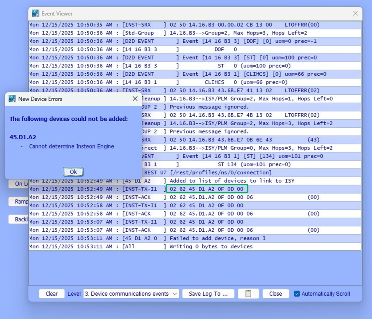 @gssincla , your event viewer is showing commands being sent TO the PLM. I don't see any evidence the PLM is acknowledging the commands. The following is a section from the end of your event viewer post. There should be PLM acknowledge responses [INST- ACK] after each command sent by the ISY [INST-TX-I1]. Hopefully the PLM has simply locked up. Try a power cycling both the PLM and ISY. If that does not work, it may have given up. Sun 11/16/2025 23:25:22 : Create REST U7 [/rest/nodes/57%2030%20F4%201/cmd/DON/0/51] Sun 11/16/2025 23:25:22 : U7 Rest: submitCmd([57 30 F4 1],[DON],[<NULL>]) Sun 11/16/2025 23:25:22 : [INST-TX-I1 ] 02 62 57 30 F4 0F 13 00 MISSING PLM ACKNOWLEDGE Sun 11/16/2025 23:25:23 : Create REST U7 [/rest/nodes/57%2030%20F4%201/cmd/DON/0/51] Sun 11/16/2025 23:25:23 : U7 Rest: submitCmd([57 30 F4 1],[DON],[<NULL>]) Sun 11/16/2025 23:25:23 : [INST-TX-I1 ] 02 62 57 30 F4 0F 13 00