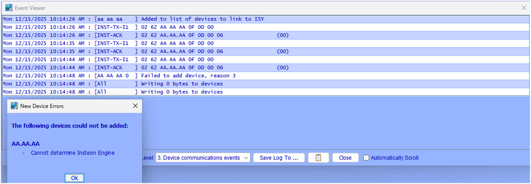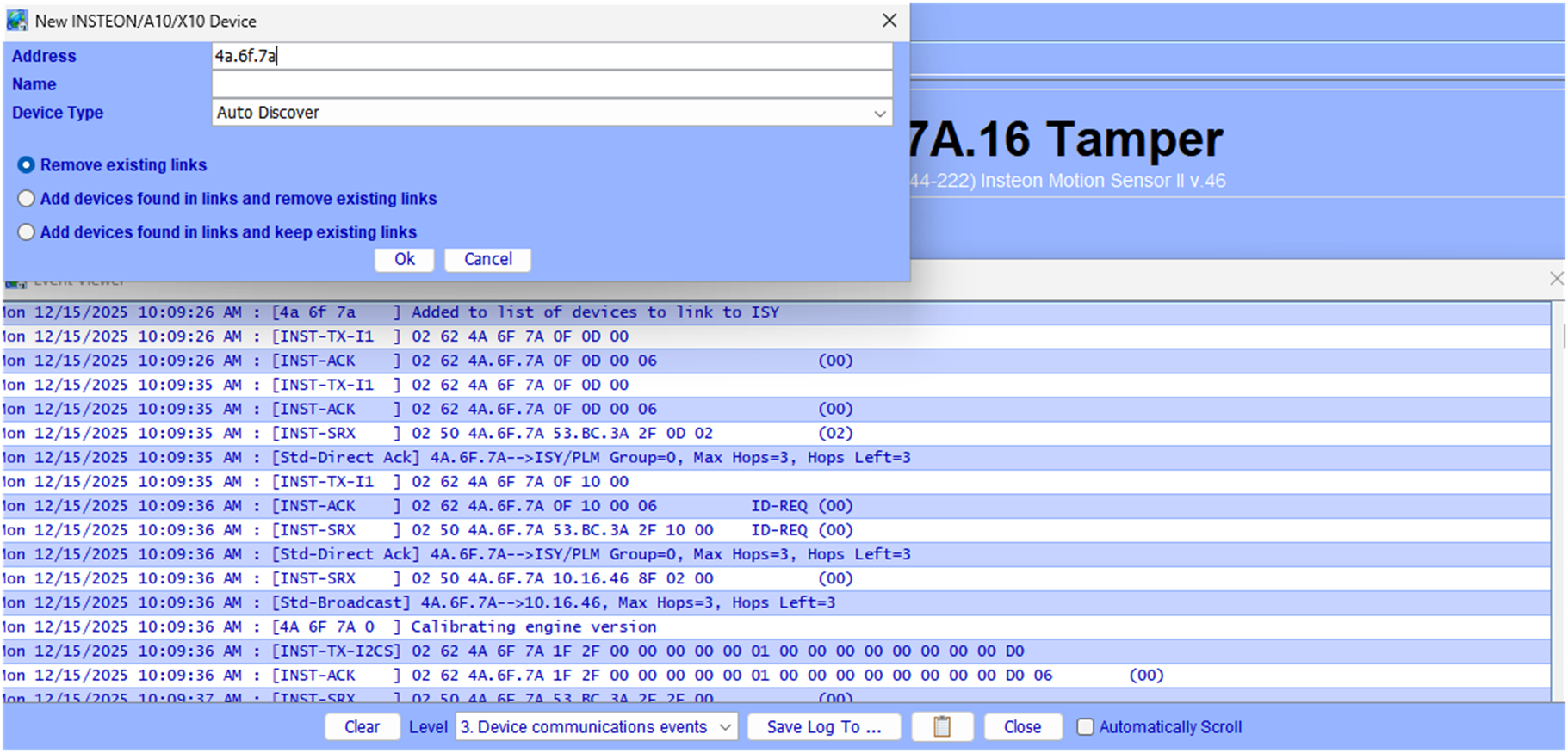 @PapaBear , I've been taking some swings at this and have not been able to reproduce what you are seeing. I've tried different communication modes (I1 vs I2), linking methods, power methods, and device versions. Things seem to just work. Would you mind posting the contents of your Event Viewer when things fail? The following is what I get when I intentionally enter in the device address. The ISY tries 3x to communicate with the device and then times out with the error message. Another possible check - If your MSII has been linked to the PLM previously, it will still contain the PLM address (even after a factory reset). Assuming the PLM still contains your MSII link (hasn't been restored from backup), you will see the MSII address pop up in the event viewer when you apply power. The communication below is from my MSII @4A.6F.7A telling the PLM that it has turned on when power is applied. Use this to quadruple check your device address (labels do get old and disfigured). The following is the method that I've settled on for linking the MSII's. Using "Auto Discover" is easier that scrolling to the bottom of the device list, and it populates the Sensor Version (v.46 below). If none of this appears to work, it is possible you simply have a defective MSII or RF Interference in the area around your PLM. You could try linking the sensor away from the PLM but close to a different RF repeater. The MSII's are 915 MHz and it's possible that you would have other devices in this range. That's not a problem that I've encountered. It is also possible that you have device(s) spamming the powerline and disrupting things while you're trying to add the device. The event monitor should show evidence if this it the case.