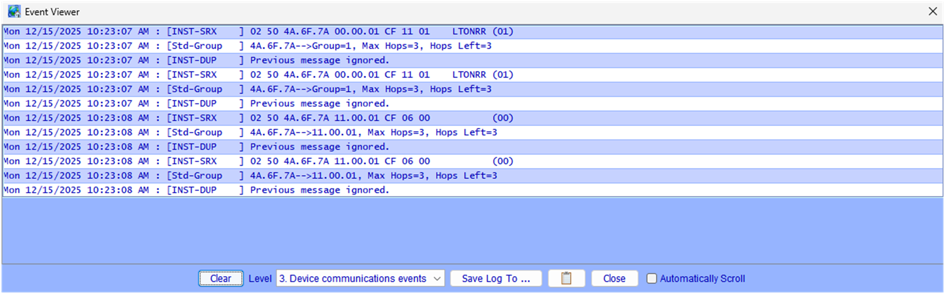 If your program turns of/off a single device, it will request a response from the device. If your program executes a scene, no cleanups are performed. Example program with a Scene ON + a device On. The event viewer output shows that the scene does not request a response from the device. Turning the device itself on will request a response. Test - [ID 0071][Parent 0003][Not Enabled] If - No Conditions - (To add one, press 'Schedule' or 'Condition') Then Set 'SC Basement Bed' On Wait 2 seconds Set 'Basement / Basement Bed' On Else - No Actions - (To add one, press 'Action') EVENT VIEWER OUTPUT ###### following is the program turning on a ascene for my basement light - no verification is performed ### Thu 12/11/2025 08:43:42 PM : [ Time] 20:43:48 7(0) Thu 12/11/2025 08:43:42 PM : [INST-TX-I1 ] 02 62 00 00 59 CF 11 00 Thu 12/11/2025 08:43:42 PM : [INST-ACK ] 02 62 00.00.59 CF 11 00 06 LTONRR (00) ###### program turning on the individual light - Light responds with 2 Hops left ######### Thu 12/11/2025 08:43:44 PM : [INST-TX-I1 ] 02 62 13 0A 51 0F 11 FF Thu 12/11/2025 08:43:44 PM : [INST-ACK ] 02 62 13.0A.51 0F 11 FF 06 LTONRR (FF) Thu 12/11/2025 08:43:44 PM : [INST-SRX ] 02 50 13.0A.51 53.BC.3A 2B 11 FF LTONRR (FF) Thu 12/11/2025 08:43:44 PM : [Std-Direct Ack] 13.0A.51-->ISY/PLM Group=0, Max Hops=3, Hops Left=2 Since your scene sounds like it is intermittent, I don't believe you have a link problem. If there were bad links, the devices would never respond. If you wish to look for bad or missing links,: Right click on a device in the admin console tree. Select "diagnostics/show device links table" Once the link table has finished populating, click the "compare" tab at the bottom of the table. A second table will open showing what the ISY believes the table should contain. Any errors will be noted in the original table. ###### Note - If you see an error flagged with a data value of ": EA" this is not an actual error. #####Devices that show errors can be corrected by right clicking the device and using the "restore device" For assessing communication issues - You can query your devices with the Event Viewer open and set to level 3. Inspect the "Hops remaining" response from the device. Normally commands are sent with max Hops = 3. Responses received back with 3 hops remaining is excellent, 0 not so much. You can also perform a scene test from the "Tools Menu". This will turn a scene on and then back off. It will request cleanups from the devices and indicate whether they responded properly. This is actually a rather rigorous test.