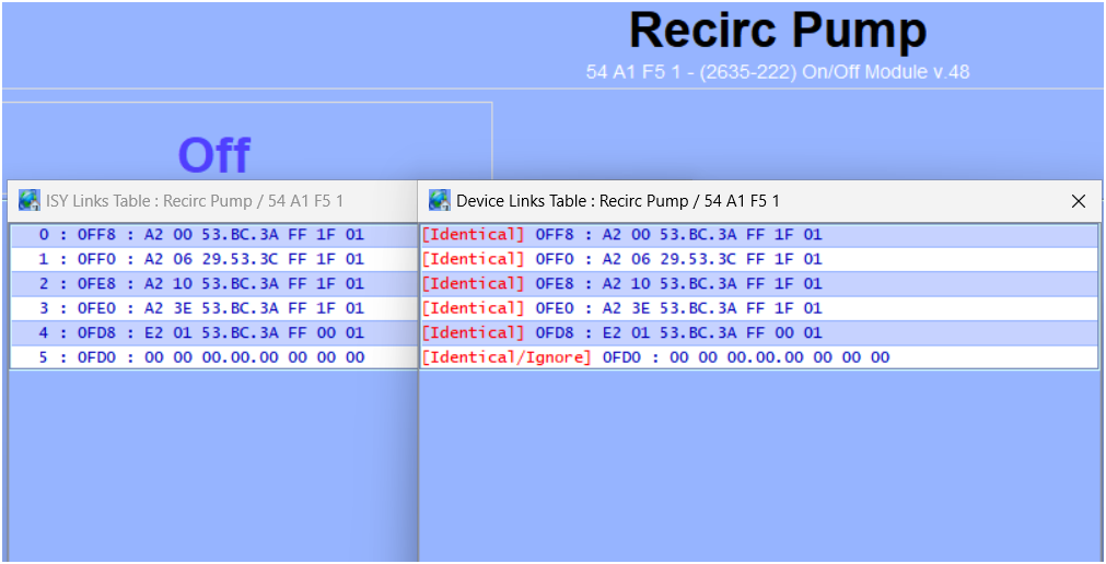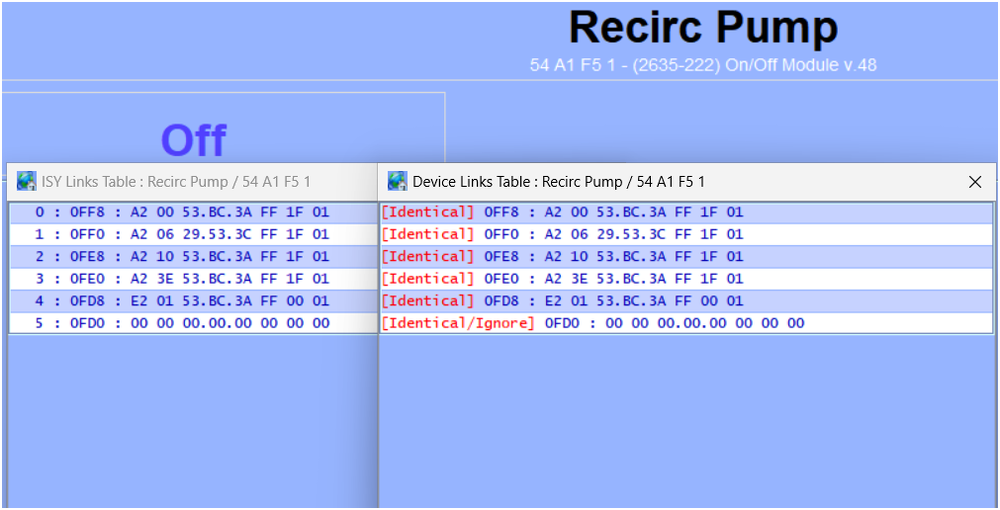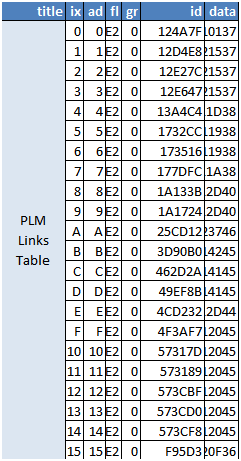 @pinlawr , Interesting that you are seeing the .Rec files reset on devices where you are writing parameter changes. Very curious if your program delay helps reduce or eliminate the problem. Unfortunately, copying a .REC file from one device to another will not completely resolve the problem. The REC file is a binary memory map for the specific device. When you copied the REC file to the missing device you also copied all of the source device's settings and scene members. The following is a REC file from one of my Switchlincs viewed in Hex. The items in Red are the link table contents for the device.
