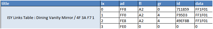 The ISY is still sending a group 12 Off command that may be affecting things. A program is being triggered because of your "scene test". Likely not the cause of everything failing, but it's definitely complicating things. Can you open the event viewer on level 3 and perform "Link Table Read" on "Dining Vanity Mirror (4F 3A F7 1)"? Copy the event viewer to the clipboard and paste to the forum. Please also post the contents of the Link table. I'm curious if you are getting Nack responses. The following are examples of the event viewer and link tables for one of my simpler devices. I've edited the event viewer to show only the 1st two link table reads. Sat 04/04/2026 09:48:19 AM : [INST-TX-I2CS] 02 62 54 A1 F5 1F 2F 00 00 00 0F FF 01 00 00 00 00 00 00 00 00 C2 Sat 04/04/2026 09:48:19 AM : [INST-ACK ] 02 62 54.A1.F5 1F 2F 00 00 00 0F FF 01 00 00 00 00 00 00 00 00 C2 06 (00) Sat 04/04/2026 09:48:20 AM : [INST-SRX ] 02 50 54.A1.F5 53.BC.3A 2F 2F 00 (00) Sat 04/04/2026 09:48:20 AM : [Std-Direct Ack] 54.A1.F5-->ISY/PLM Group=0, Max Hops=3, Hops Left=3 Sat 04/04/2026 09:48:20 AM : [INST-ERX ] 02 51 54 A1 F5 53 BC 3A 15 2F 00 00 01 0F FF 00 A2 00 53 BC 3A FF 1F 01 B8 Sat 04/04/2026 09:48:20 AM : [Ext-Direct ] 54.A1.F5-->ISY/PLM Group=0, Max Hops=1, Hops Left=1 Sat 04/04/2026 09:48:20 AM : [INST-TX-I2CS] 02 62 54 A1 F5 1F 2F 00 00 00 0F F7 01 00 00 00 00 00 00 00 00 CA Sat 04/04/2026 09:48:20 AM : [INST-ACK ] 02 62 54.A1.F5 1F 2F 00 00 00 0F F7 01 00 00 00 00 00 00 00 00 CA 06 (00) Sat 04/04/2026 09:48:21 AM : [INST-SRX ] 02 50 54.A1.F5 53.BC.3A 2F 2F 00 (00) Sat 04/04/2026 09:48:21 AM : [Std-Direct Ack] 54.A1.F5-->ISY/PLM Group=0, Max Hops=3, Hops Left=3 Sat 04/04/2026 09:48:21 AM : [INST-ERX ] 02 51 54 A1 F5 53 BC 3A 15 2F 00 00 01 0F F7 00 A2 06 29 53 3C FF 1F 01 4B Sat 04/04/2026 09:48:21 AM : [Ext-Direct ] 54.A1.F5-->ISY/PLM Group=0, Max Hops=1, Hops Left=1