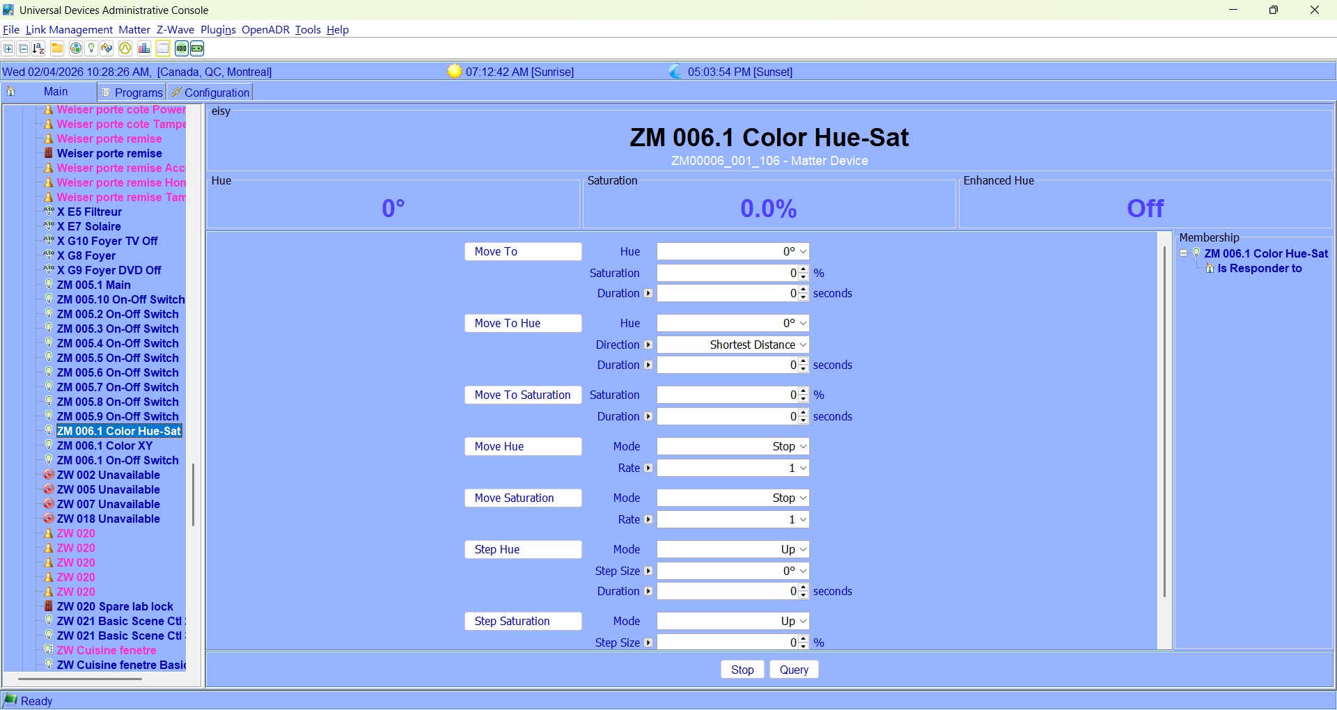Having discovered the possibility to rerun the Matter device Interview, I relaunched the interview on one of the Philips Hue bulb nodes (when you share to Matter from the Hue app, all devices get shared at once). I had initially shared them many months ago in Matter testing, and only had device On Off nodes. Lo and behold, the new interview updated all the Philips Hue devices, adding all the color and hue nodes for the lights with those capabilities. That's great, and reinterviewing sure beats deleting and adding back devices. Hue White bulbs give you On Off nodes (with dimming) Hue White Ambiance give you On Off, and Color Temperature nodes Hue White and Color give you On Off, Color Hue-Sat, and Color XY nodes This now leaves Hue bulbs with two ways to control them: from the Hue plugin, or directly as Matter devices. The Hue plugin offers three ways of setting the color (RGB, XY, or color name). while Matter only has XY. There is also a third way to control Hue bulbs, as Zigbee devices, but that doesn't give you all those options, and I believe cannot be done simultaneously as Zigbee and controlled by the Hue hub.