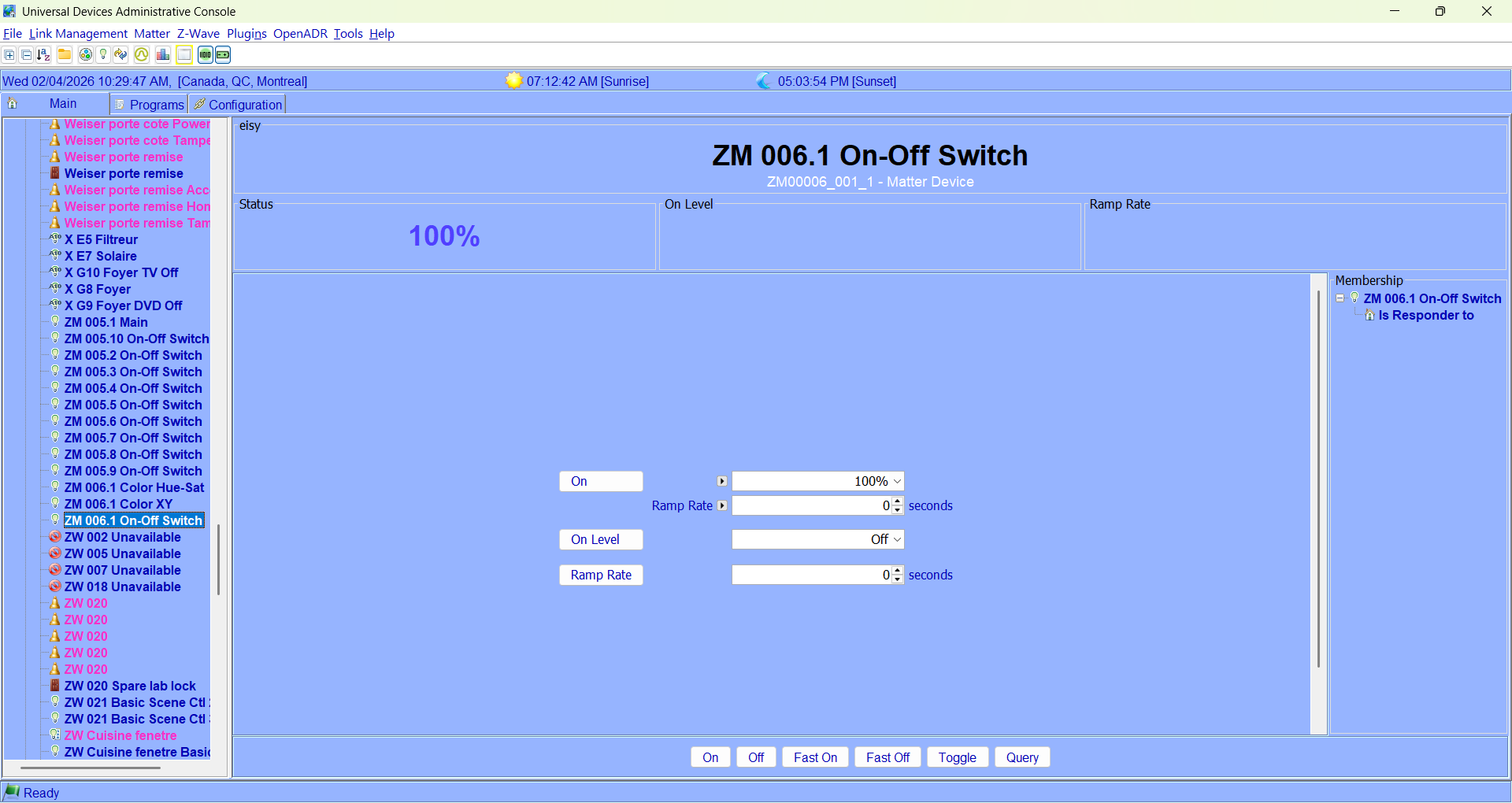 Being on a roll, I thought I'd also try the Nanoleaf bulb. This is a Thread device, and not known for being easy to work with. I already had it configured and working in Alexa, So I generated a pairing code in Alexa and tried adding it in UD Mobile. Nope, getting an error code. Ok...plan B was to share it from Alexa to Google home first, and then from Google home to UD Mobile. That worked 🙂 I think that Google home and UD Mobile are Facebook friends! The interview process took noticeably more time than the Cync bulb did, a good minute it seemed. And the end result was only an On Off device node, no color or hue nodes. Even though the Nanoleaf bulb is a color bulb. Btw you can redo Matter interviews by right clicking on the device node and selecting Matter -> Synchronize -> Update with Interview (tell us about yourself, how long have you been a light bulb?). I tried that but it remained just an On Off device. If I set the ramp rate to a slow value and turn it on, it comes up in a fast series of stepped intensities, looks like blinking. I suspect that it's the bulb firmware more than anything else since these are known to be difficult with compatibility. The same commands were smooth on the Cync bulb. I looked up the bulb in the Nanoleaf app to see if it would alert me to any firmware updates. Nope. But still, now the Nanoleaf bulb works everywhere: Alexa, Google home, UD Mobile, and in the Nanoleaf app. We're getting there!