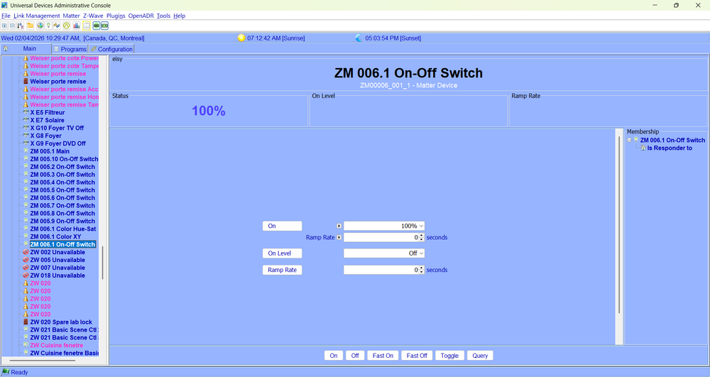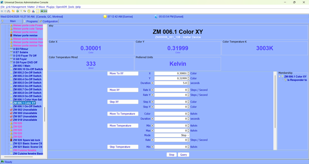 Tweakers delight! Or is that tweak the light? After adding that GE Cync bulb back into my eisy (to help out another poster in a different thread) I started poking around in admin console to see what I could do with it. I hadn't really experimented with Matter since the initial excitement last spring. I had seen something about a color control cluster for Matter in the release notes for 6.0.3. Let's just say that they went all out with the options! I'm still trying to get familiar with what everything does. Here is a sampling of the screens for the three nodes that got created for the bulb. The On-Off Switch node: The Color XY node: The Color Hue-Sat node: Notice the scroll bar on the right? Too much to fit on one screen! You'll notice the Duration and Rate settings, allowing you to set the time for the settings to "morph" to the new values. This takes programmability to the next level 😊 The color XY setting might be unfamiliar to most of us (myself included). We might be more used to the RGB method with values from 0 to 255 for each color. XY settings correspond to coordinates on a color chart, and are fractional (decimal settings). I found the following page, which is really helpful for this. It has the color chart, and a RGB to XY (or vice versa) utility: https://viereck.ch/hue-xy-rgb/ Enjoy!