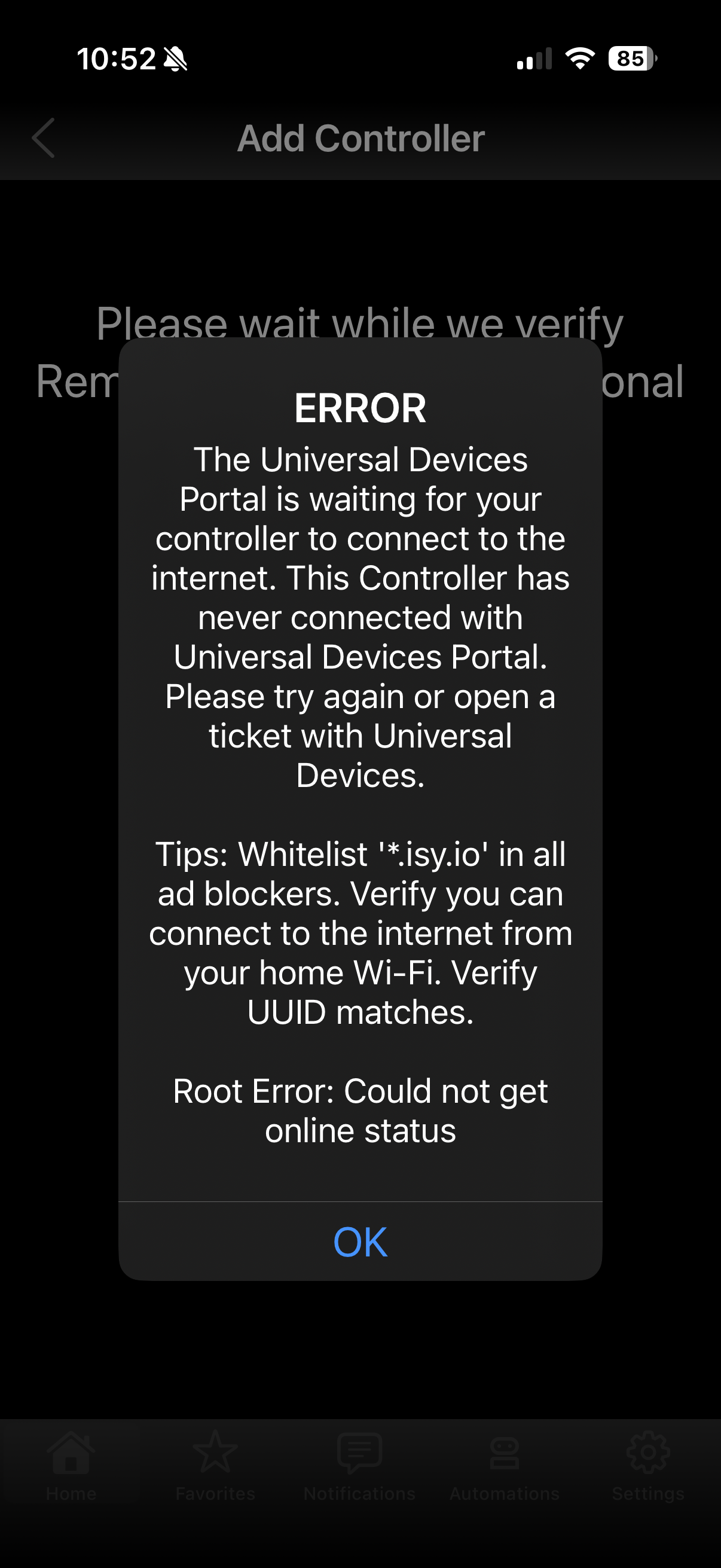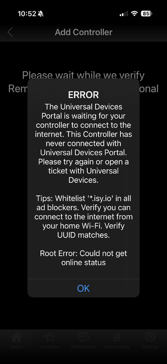 Hey Geddy, thanks for the quick response and the tips; the key one was keeping Safari from auto-unzipping the firmware files (I was unaware that it did so by default, and just learned how to stop it; part of what confused me about that was that there were still zipped files in subfolders). I'm pretty sure my ISY doesn't have a zwave board (S/N in attached photo, if that's any help; I couldn't find a cross-reference). After reviewing a few discussions, I decided to go for it and upgrade to 5.3.4, which seemed to go smoothly once I fed it the zipped file. I was expecting more radical changes in the Admin Console, but it relaunched with no apparent changes except the expected reversion to the default User ID/Password. I also verified that I can still control my Insteon modules from the console. (The latter is now running on my M3 MacBook Air; the 1TB SSD on my 11-year-old iMac took a dump on me yesterday, and so far appears to be unrecoverable. It's said that trouble comes in threes; I'm holding my breath...) BTW, I tried to heed your advice about backing up my programs, but can't find the “my programs” root to which you refer; I wonder if I'm running into Mac/PC differences. (Right-clicking ain't a normal Mac action, but Ctrl-click allegedly does the same thing. However nothing I right-click on yields what you're describing.) Am I looking for some files outside of the Admin Console ("Finder" files, in Mac parlance)? I then launched UD Mobile with high hopes, and it progressed nicely until it tried to connect to the UD Portal, yielding the following error message: In the Admin Console I found an "Enable Internet Access" command, which I did and got a success message. However, UD Mobile still errors out with the above message. I don't have any active content blockers to my knowledge, and the UUID is correct. On the theory that UD Mobile might have gotten corrupted with all my unsuccessful tries, I deleted and reinstalled it, but with the same results. I also power-cycled the ISY to see if that would help; no joy. I'm now wondering if I need to get involved with port-forwarding and/or static IPs. BTW, the very first time I launched UD Mobile and selected my 994i, I got a message offering a 30-day trial of Remote Access. I wasn't particularly interested (I'm mainly looking for iPhone control of my stuff around the house), but there was no apparent way to decline and proceed, so I accepted. Interestingly, that message hasn't reappeared in multiple subsequent attempts to activate UD Mobile, even when I deleted and reinstalled the app. Any advice, other than to open a UD ticket as suggested in the error message? (And if I try, will I just get told the 994i is no longer supported?) Thanks, ~Ken