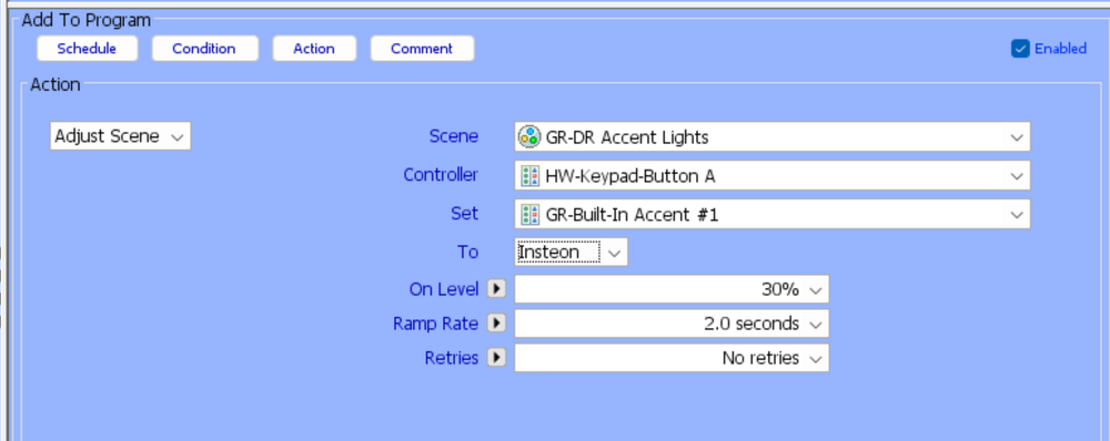 You are adjusting the on-level for each device when it is locally controlled (i.e. when you press the SwitchLinc button). What you want to do is modify the on-level for the device when it is activated by a scene controller. So, in the example above, the on-level for "GR-Built-In Accent #1" would be set to 30% when the scene is activated by the controller "HW-Keypad-Button A". In your case, you would want "Set" to be "Master Bath Sink Lts - Load" and the "Controller" to be "Master Bath Sink Lts - Ctl". -