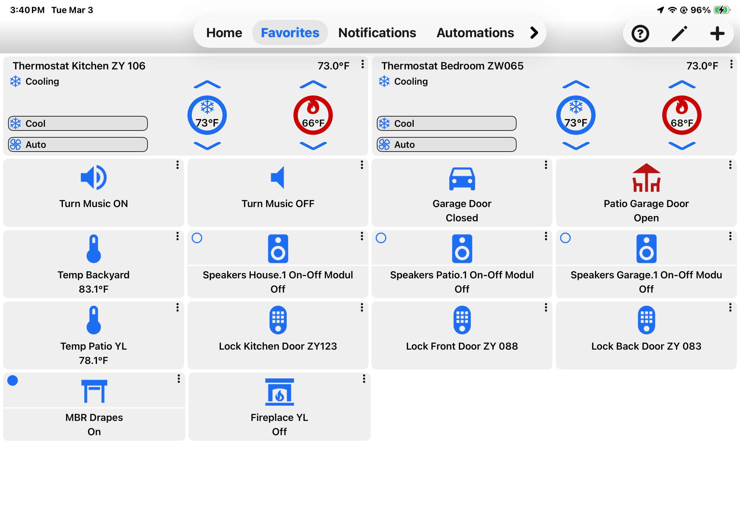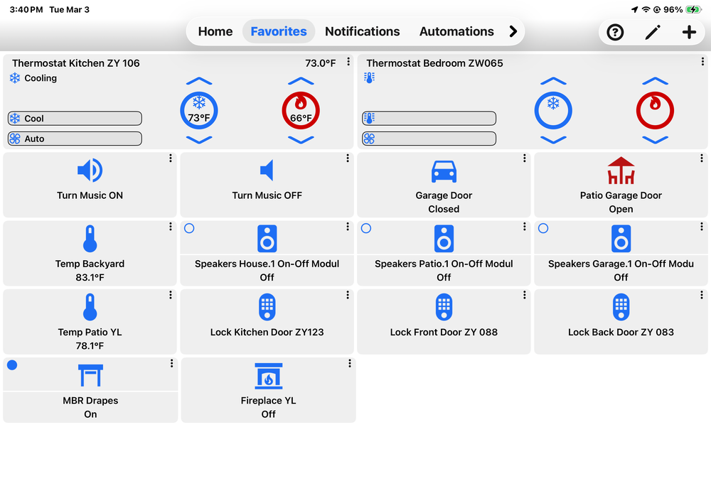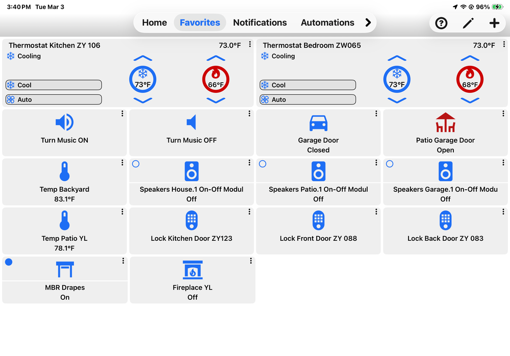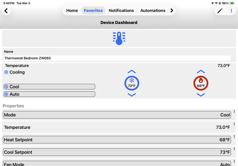 No big deal but annoying. Open UD mobile and two thermostats show in favorites with only one populated with current stats. The only way to show current stats is to switch to dashboard. It then will show all the correct values on the favorites view. Have to do this every time UD Mobile is opened….