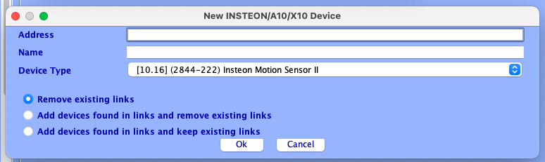I continue to wonder if you are not doing it correctly. When I attempt to do so, the pop-up windows look differently than the ones you have. Here is how I believe it needs to be done: Choose "link Management" and navigate to Motion Sensor II, as shown below: You should get a pop-up that looks a little differently than the one you showed. The pop up is not "auto discover" but should have the device type prepopulated with the motion sensor II. Manually add your address in the top box. Choose "OK". Hopefully, it should find it.