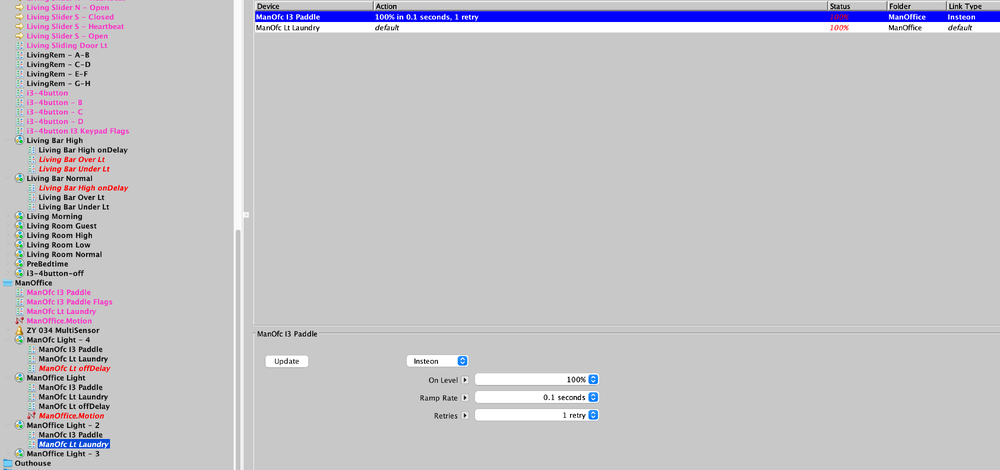 @hart2hart, So on the left in my pic, notice I am on the Insteon device controller for the scene, that is why I get the repeat field. You are on the scene itself ; you would get the same if you are on, for example, my offDelay device, or a z-wave device. Scenes are from the perspective of the Controller for the command they send. So if you fire the scene from a program, look at what the scene name sees. If you are firing from an Insteon switch it will send the commands to each of the receivers the way you set it up. So in mine, on the right, this is showing what the Insteon switch is sending to another Insteon switch. You can set the command to whatever you want, default means it just sends pass through whatever the Controller is sending. Makes it possible to send a DOF to one device in a scene. Appoligise if you knew most of all that, but I had treated scenes for a long time just as sending individual level commands, but they can do quite a bit more, if you want. Certain devices have limitations as well. Its why the VirtualSwitch devices wouldn't work in scenes so long, they were just status devices & didn't sent commands. Hope this helps.