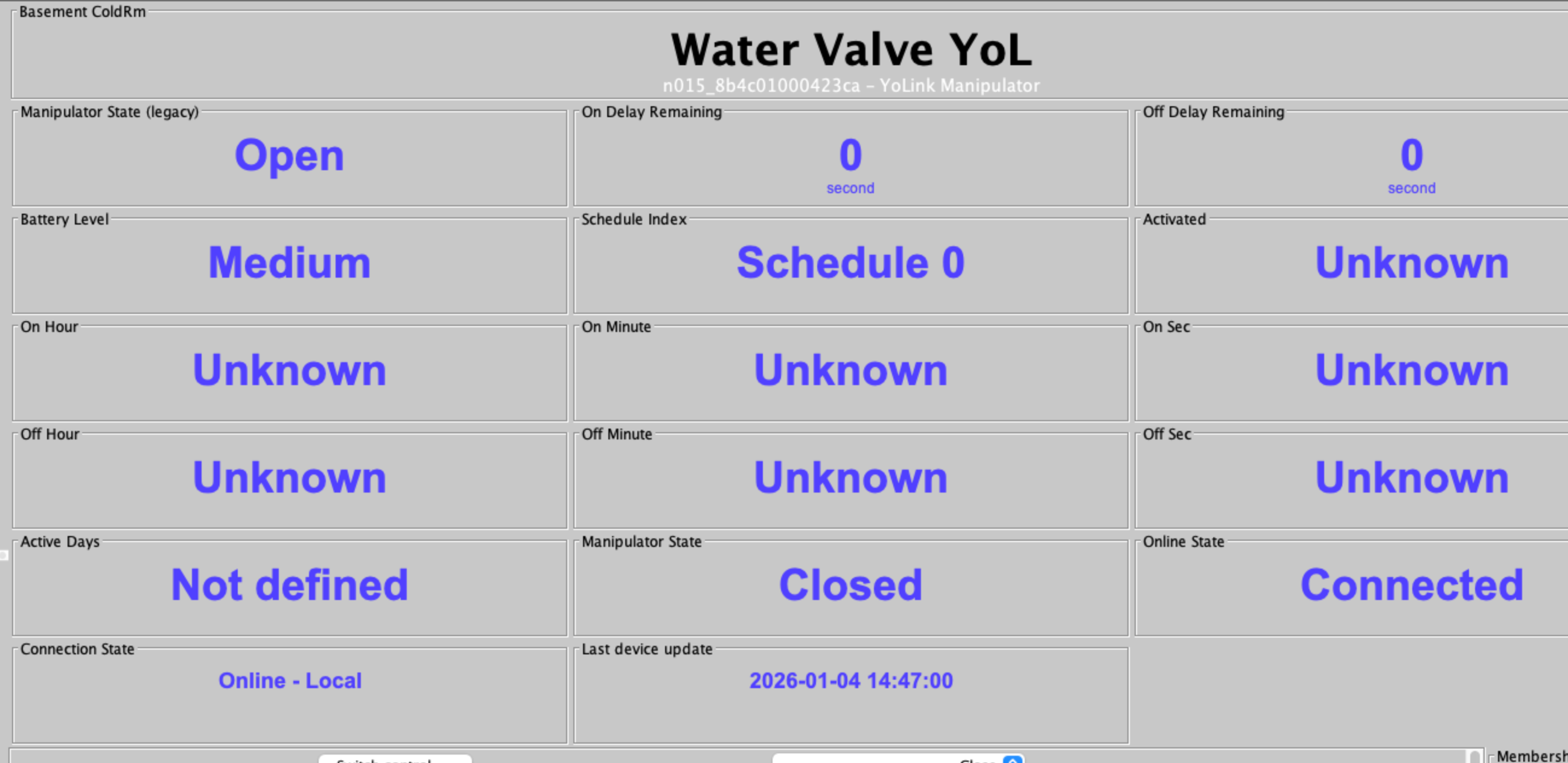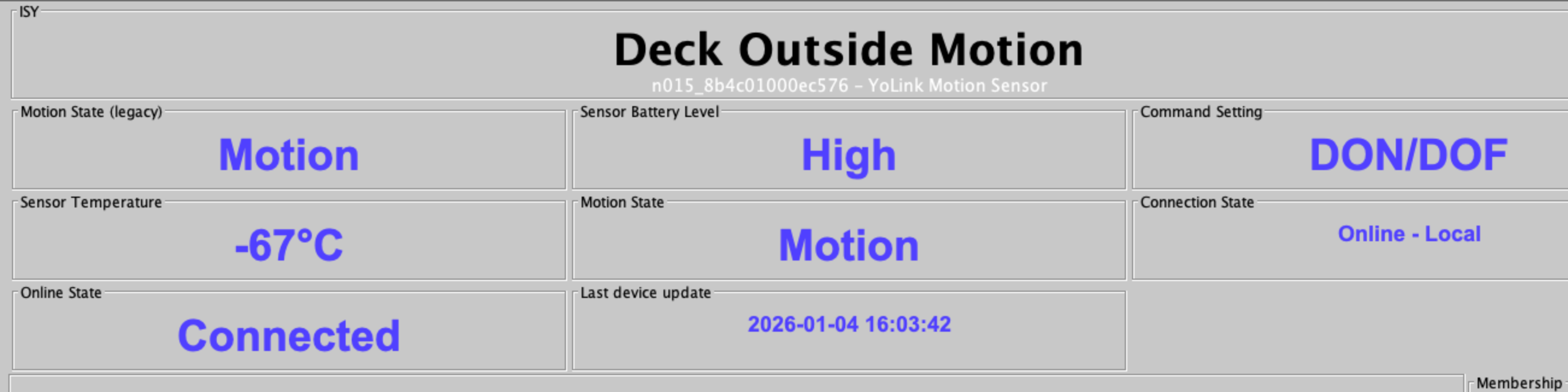 @Panda88 , Low on the priority list, but for feedback. I am growing my YoLink fleet & added a couple motion sensors to test. they are the YS7806-UC, seems the temperature is showing -67C on the AC no matter the temp showing on the app device screen. EDIT: seems to be well off for the Two button FOB YS3614-UC Again, I don't actually use these, just to add something to your todo list