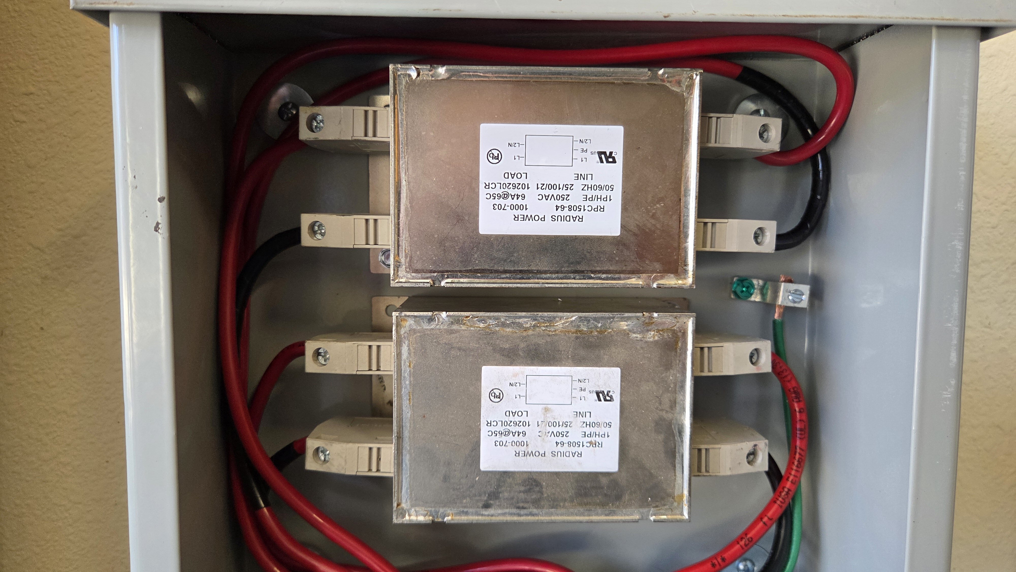 Just thought I would give an update to this adventure. As you may recall, I had 2 Powerwall 3's along with 2 Gateways installed. Almost immediately, I experienced flickering of all lights (LED) that were connected to Insteon dimmer switches. That is when I came to this forum. We tried the Ferrite Cores primarily they were the least cost (my installer was trying to look out for my wallet). They really did not work Last week, we installed the EMI filters that hopefully will show up in the attached picture. Immediately everything went back to normal. Flickering disappeared, scenes programmed into the eisy started funtioning again as programmed and expected, and accessing devices in my eisy network could now happen again. So, I would say mission accomplished. If you want to know more, my installer is Good Faith Energy in Addisson, TX. Amanda Haines was my project manager. Apologies - they were installed upside down from the label standpoint and I was too lazy to rotate the photo. BTW - These are the same filters discussed by NCSTATE1978 is the early days of this topic thread.