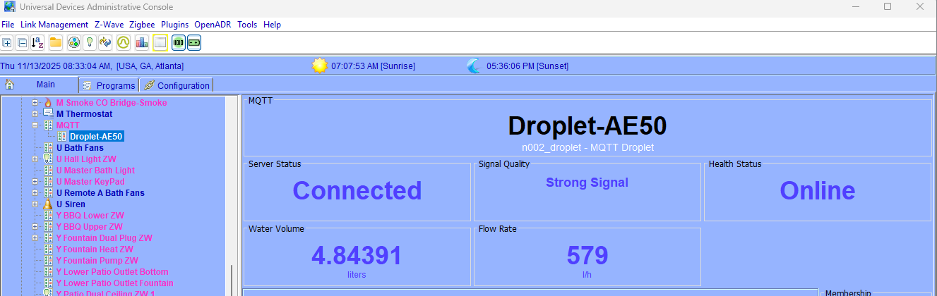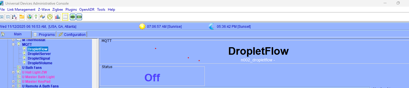 Hi All, I am trying to configure the Droplet water flow device which supports the MQTT interface. I am struggling with the .YAML entry (I think). I have MGTT added in the Polyglot window and can see it in the EISY admin control window. Has anyone successfully configured this device? If so, could you provide the details - the Droplet app settings, the MQTT configuration settings and the /YAML file you used. I have been able to at least see the details of the device in the Polyglot log, but getting it to show up in the EISY interface is where I seem to be getting stuck. I have been back and forth with the Droplet support AI bot all afternoon, and it has been helpful, but I am still not getting exactly what I need. I think because it just does not understand the EISY. I have been an ISY/EISY user for many years, but this is my first foray into MQTT. There is another post about the Droplet device in this forum who was working on this same device a few months ago. I have asked my question in that post as well, but I am hoping that someone else might also have solved this issue. Thanks!