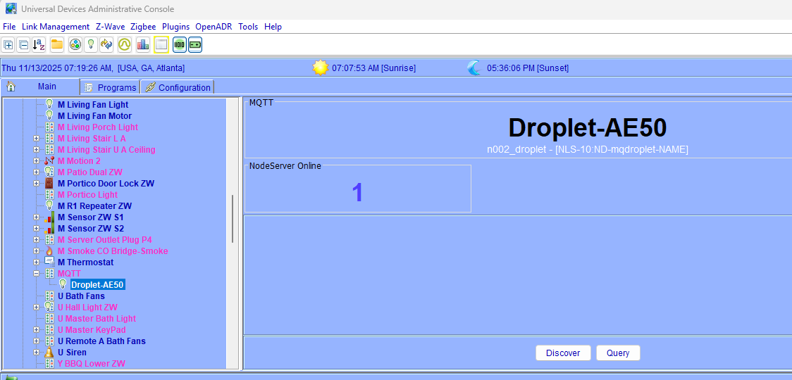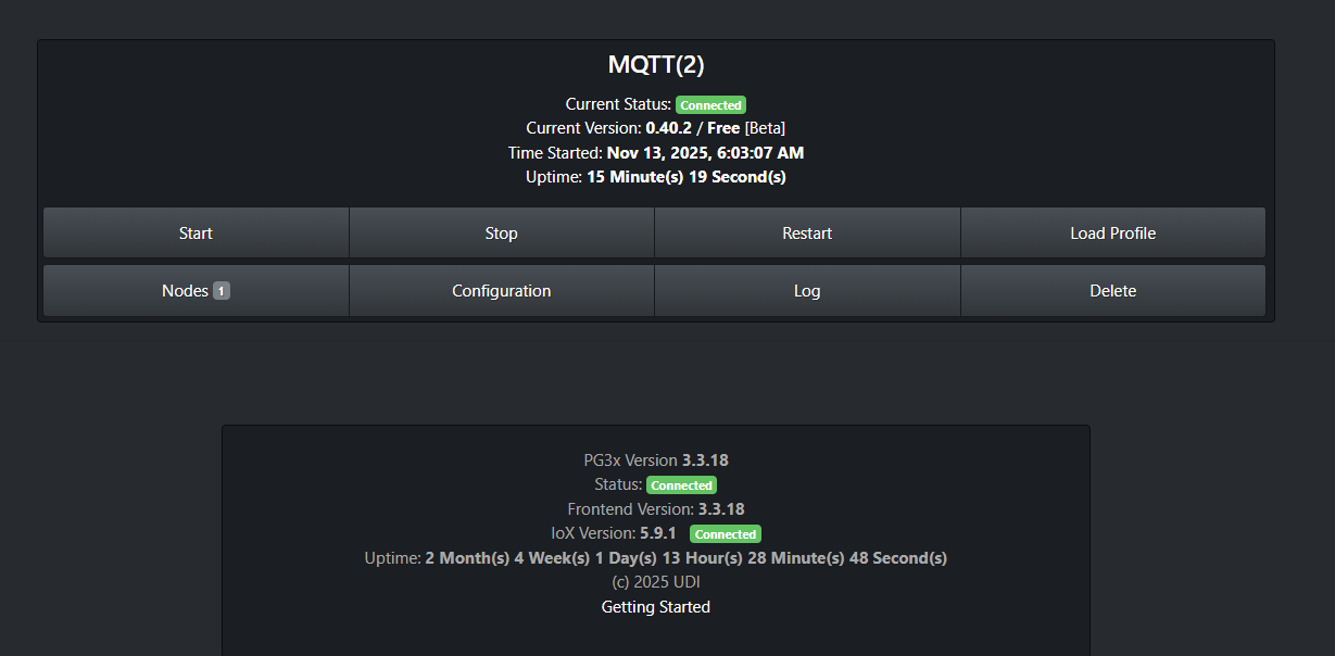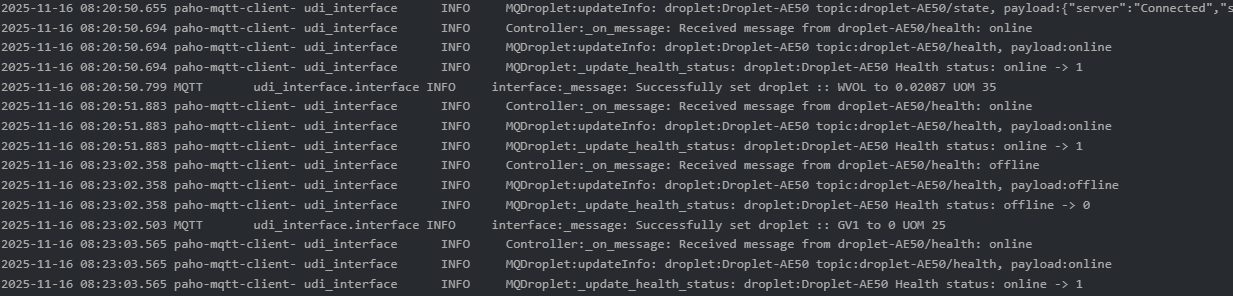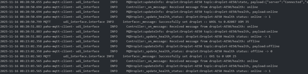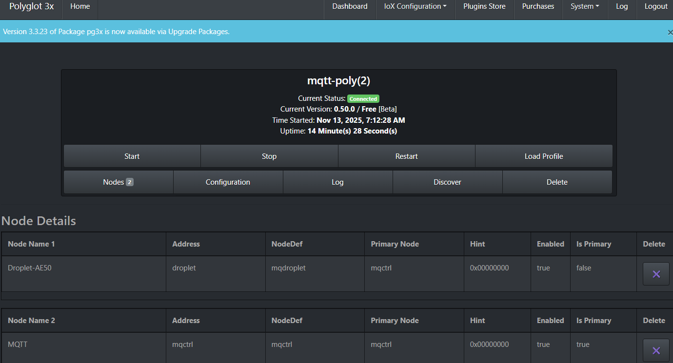 Hi @sjenkins and @TriLife I have installed the beta MQTT and updated to the settings listed above. FYI - I did delete the production version of MQTT since I have no other MQTT devices and I wanted to make sure I was using the correct version. Here is my yaml file: devices: - id: "DropletH" type: "droplet" status_topic: "droplet-AE50" cmd_topic: "droplet-AE50" But I am getting this message in the log file. 2025-11-13 06:03:08.663 Thread-3 (parameterHandler) udi_interface ERROR Controller:discover_nodes: Device type droplet is not yet supported I have attached the full log file that was created after my most recent "restart". Did I maybe miss a step? Would you like me to continue to use this thread - or use the "generic" one you created for the beta release? debug.log
