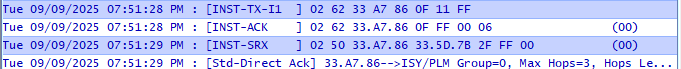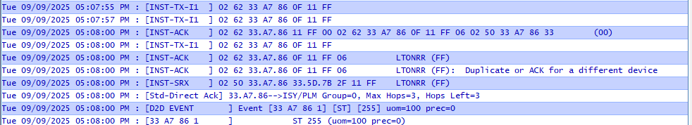 September 10Sep 10 50 minutes ago, Blackbird said: I didn't check the status of udmobile but admin console showed it off That makes sense since its status was OFF before it received the "FF" command. I only asked because your screenshot was cutoff at the [INST-SRX] line. If there is a [D2D Event] record or a record with the device's address within [] that follows the [INST-SRX] line, that tells you how the Polisy interpreted the [INST-SRX} line.