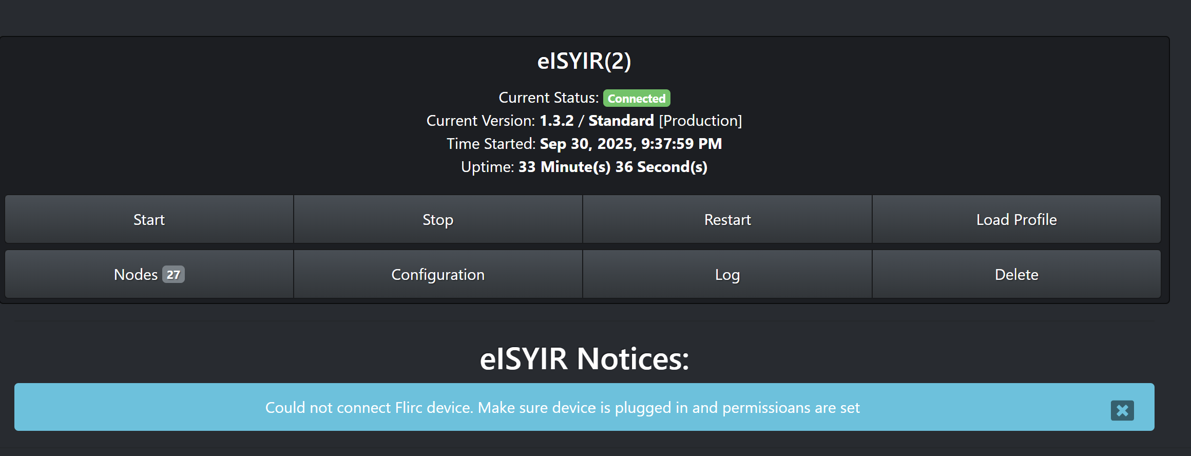 mmoore99 Posted 8 hours ago Posted 8 hours ago I have just upgraded my eisy to OS14.3/IoX 6. I am now getting the error message Could not connect Flirc device. Make sure device is plugged in and permissioans are set see screen capture below. I have tried unplugging and plugging the Flirc device but no luck. Everything was working fine before the upgrade. Any suggestions would be appreciated. Quote