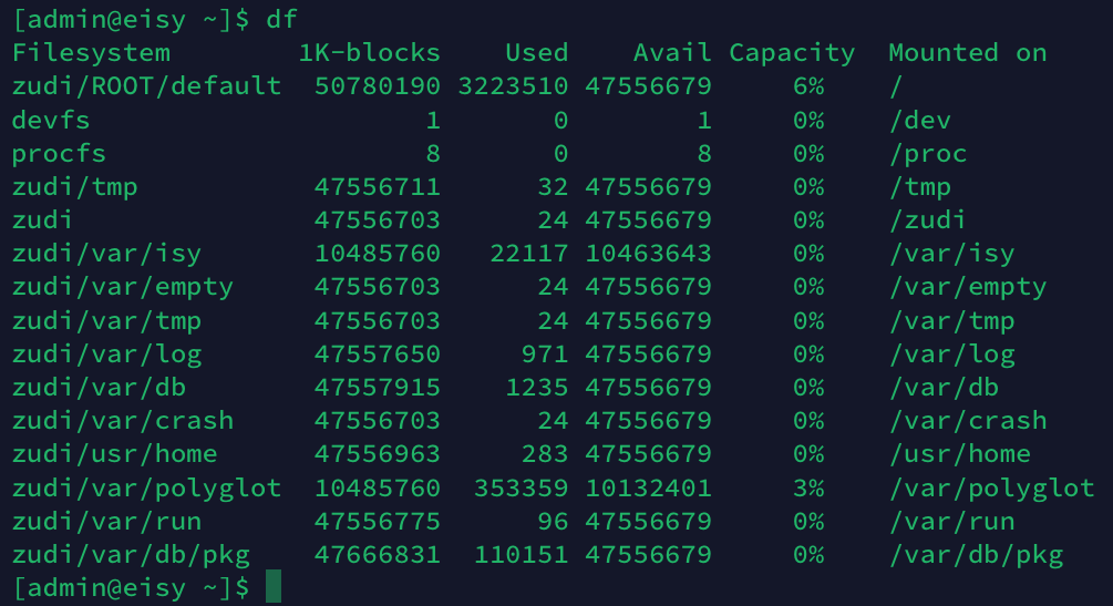 paulbates Posted 3 hours ago Posted 3 hours ago I'm preparing to upgrade my eisy to 6.0 / eisy-ui in the near future. I've been following others progress from afar. I think the disk space issue and using the df command were related to policy. I sifted through some of the threads but not 100% sure and want to be sure before proceeding. My command line days are getting more behind me and have no time logged on FreeBSD. I was able to ssh in and run df. Here are the results. I should not run into space issues? Quote