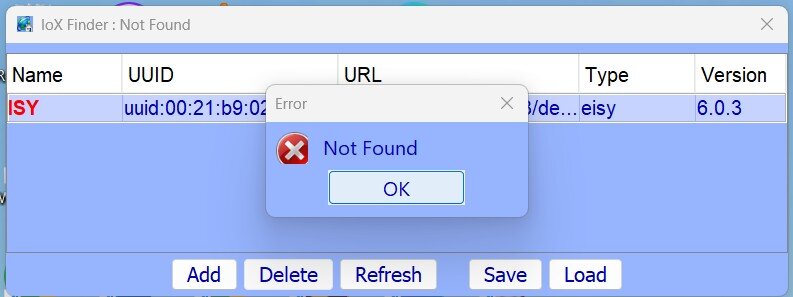 So whenever I start my IoX Finder, it finds my eisy, but then I always get a pop-up that says "Not found". I completely cleared my Java cache (all 3 check-boxes), and it still happens.